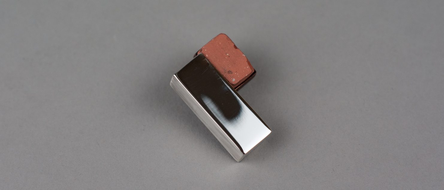 A sterling silver mirror finish brick contrasts beautifully next to textured and oxidised copper holding a red cement brick. This months brooch is inspired by the beautiful Chanel building on Pieter Cornelisz Hooftstraat, Amsterdam city centre. Whilst wondering around the city looking for somewhere to eat during my trip, I stumbled upon this designer studded street, and this stunning building. The top layer of fading brick into glass immediately struck me, and i’m not ashamed to say I think about this building on a regular basis.