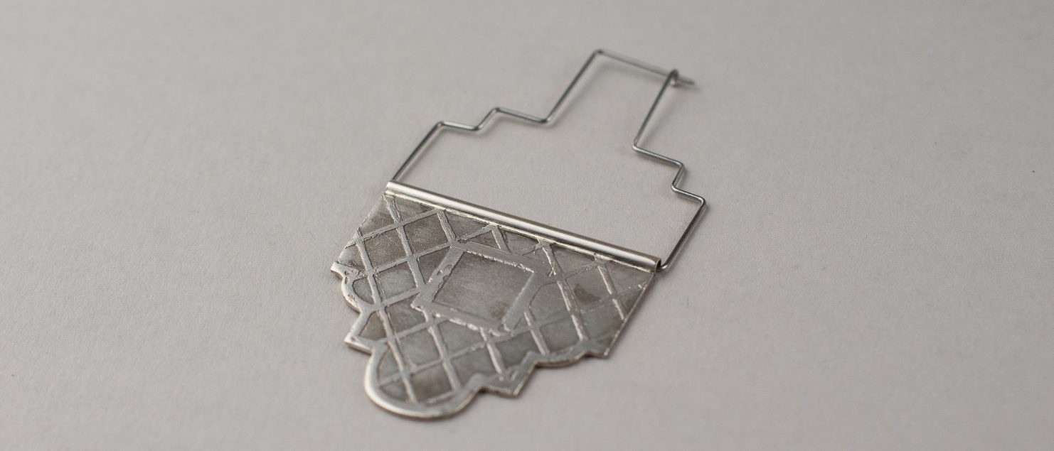 The brooch works in reflection, with the steel wire creating the silhouette of a stepped, angular gable as well as containing on of the most important parts of a brooch, the pin. Whilst the etched silver half reflects a more aged, curved design.