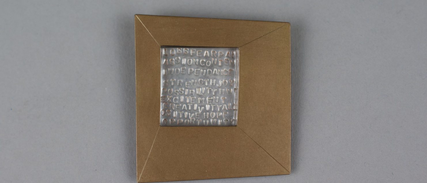 Stamping silver is an age old technique, and works brilliantly with text. Having the view of words through the window has given an almost graffiti effect, which I didn’t anticipate and absolutely love. The text also looks as good on the back as it does on the front. The whole brooch has been tumbled to give a beautiful matte texture to the brass and silver.