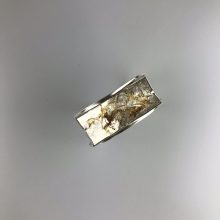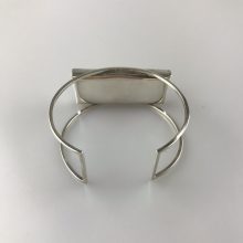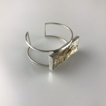 A silver ‘brick’ of grey and white cement detailed with moss sits inside a solid silver bar bangle measuring 6cm widest point.